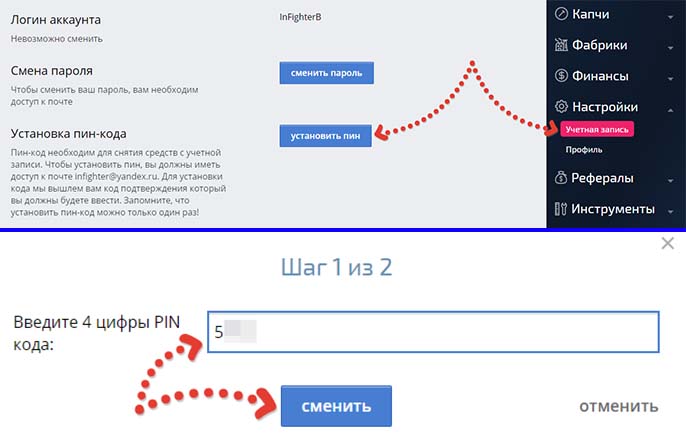 Теперь можно сразу установить ПИН-код, чтобы активировать возможность вывода средств, которые вы заработаете. Перейдите в раздел "Настройки" - "Учетная запись" и нажмите "установить пин", затем введите 4 цифры придуманного пина и нажмите "сменить".