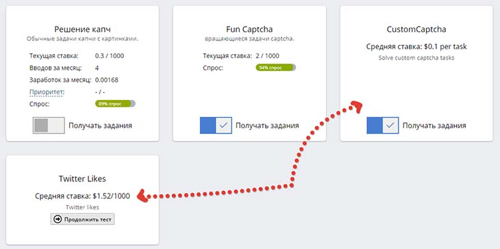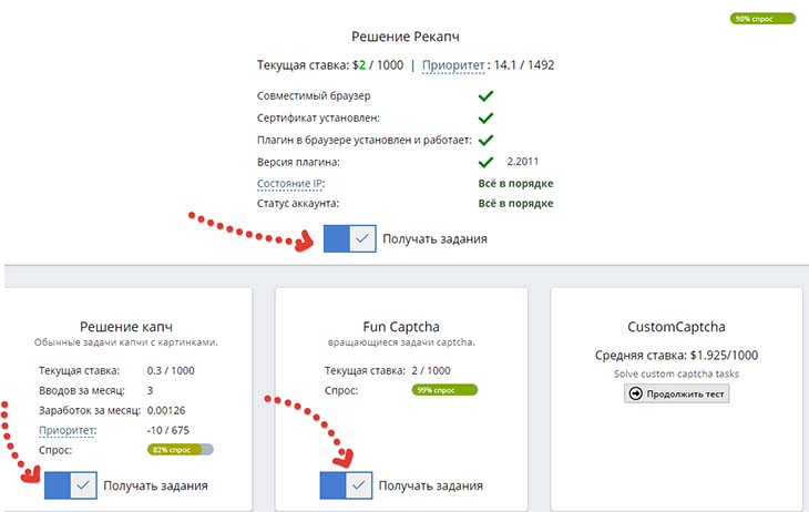 В первую очередь вам нужно включить те типы капч, с которыми хотите работать. Для начинающих рекомендую включить все типы, а для тех, кто более опытен, включить только рекапчи, "Fun Captcha", а также работу, которая будет предлагаться через "фабрики", по которым дам пояснение ниже.