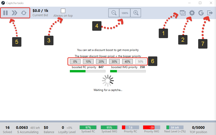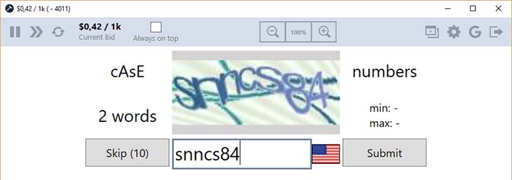 Внизу окна есть статистика, а вверху, над строкой "Current Bid" видно текущую ставку за 1000 решенных капч. И это все основное, что нужно знать для разгадывания капч через программу для компьютера.