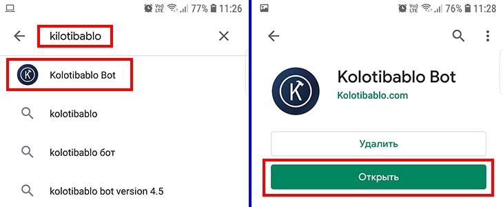 Устанавливается приложение точно также как и любое другое на андройд: в плей маркете в поиске набираем "kolotibablo", открываем найденный вариант (значок "К" на темном кружке), после чего нажимаем "Установить" и после "Открыть".