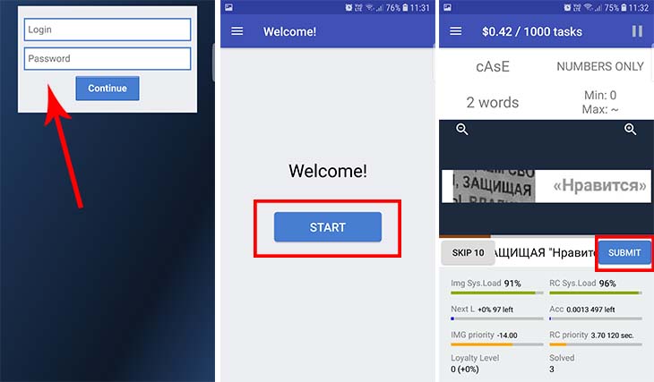 При запуске приложения вводим свои логин, пароль и проходим проверочную капчу, затем чтобы начать работу, кликаем на Start и в целом процесс будет точно такой же как в веб-интерфейсе или программе для ПК.