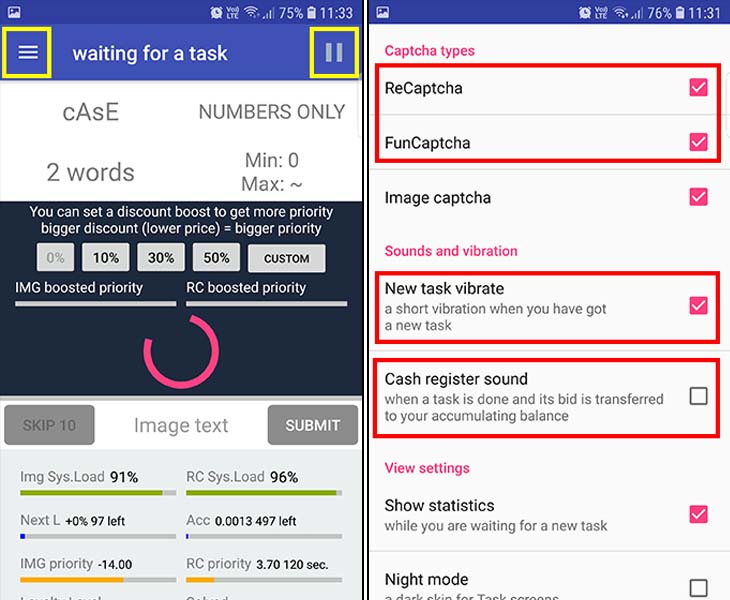 В настройках выделю лишь возможность выбрать типы капч для работы (вверху блок "Captcha types"), оповещение о новых заданиях ("new task vibrate"), если будете сворачивать приложение и хотите знать, что появилась новая работа. А также здесь рекомендую отключить опцию "cash register sound", чтобы звук не проигрывался при каждой решенной капче.