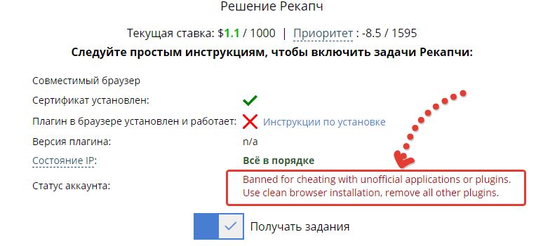 Например, работая около недели на сервисе я вдруг неожиданно получил сообщение о том, что задания по рекапче у меня заблокированы за, якобы, мошенничество с неофициальными приложениями и плагинами Колотибабло.