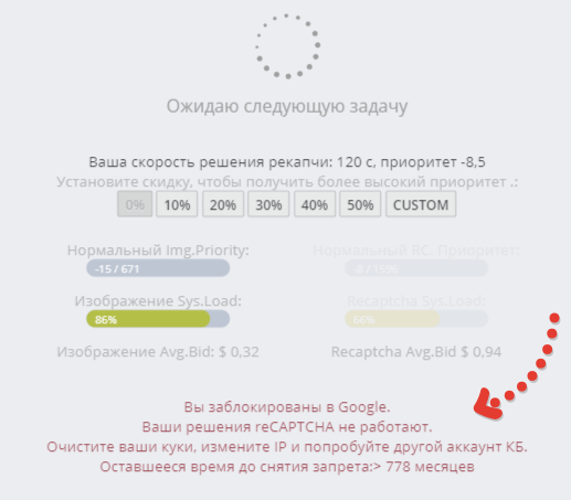 Вторая проблема, которая может возникать - блокировка со стороны самого гугла. Как и почему он это делает, мне лично непонятно. Сидишь работаешь спокойно, разгадывая рекапчи, и тут бах! Блокировка от гугл: