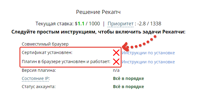 При заходе на сайт, сразу на главной странице вы обнаружите информацию, как включить возможность работы с рекапчам. Изначально напротив 2-х пунктов будут гореть красные крестики, и чтобы это исправить, выполним 2 несложных шага.